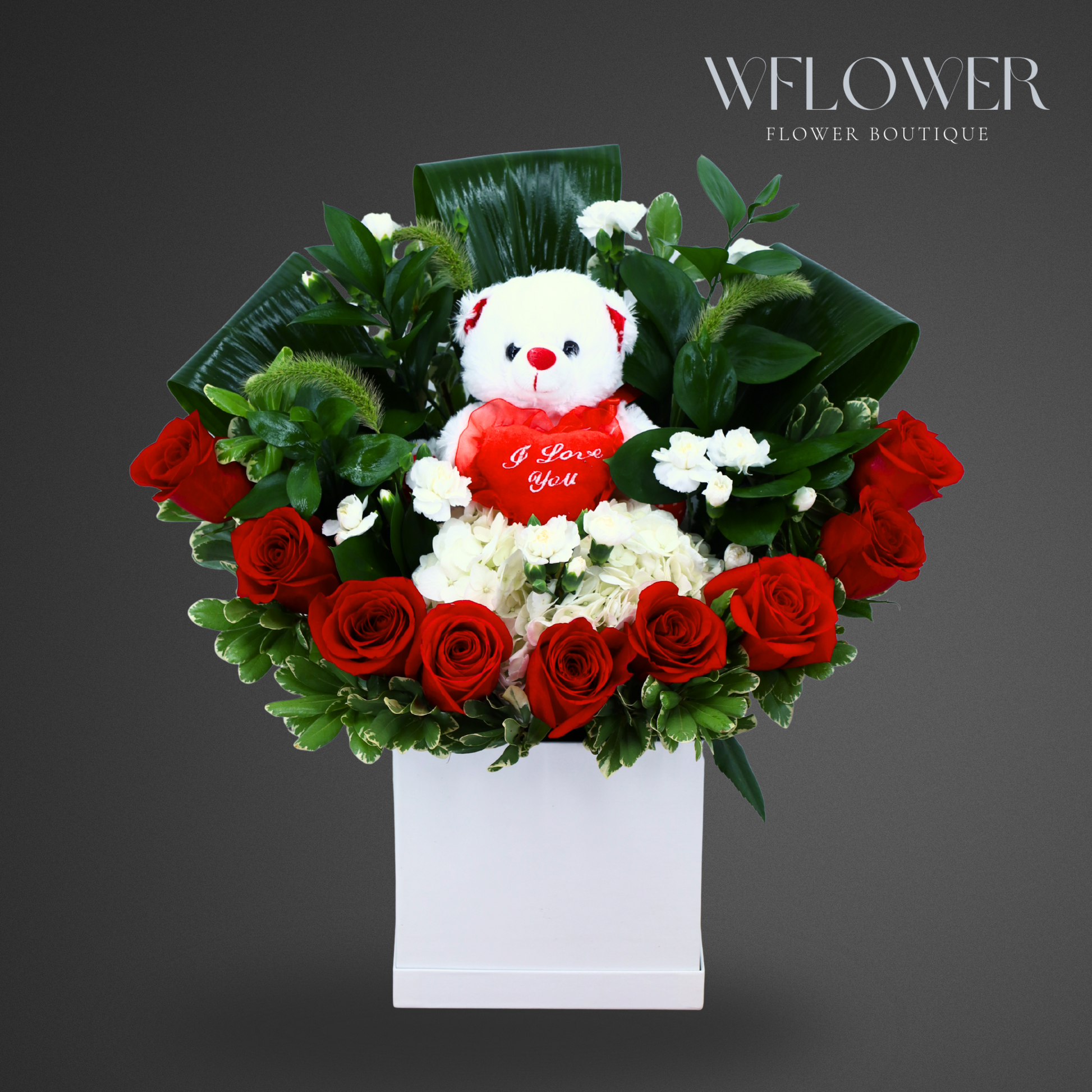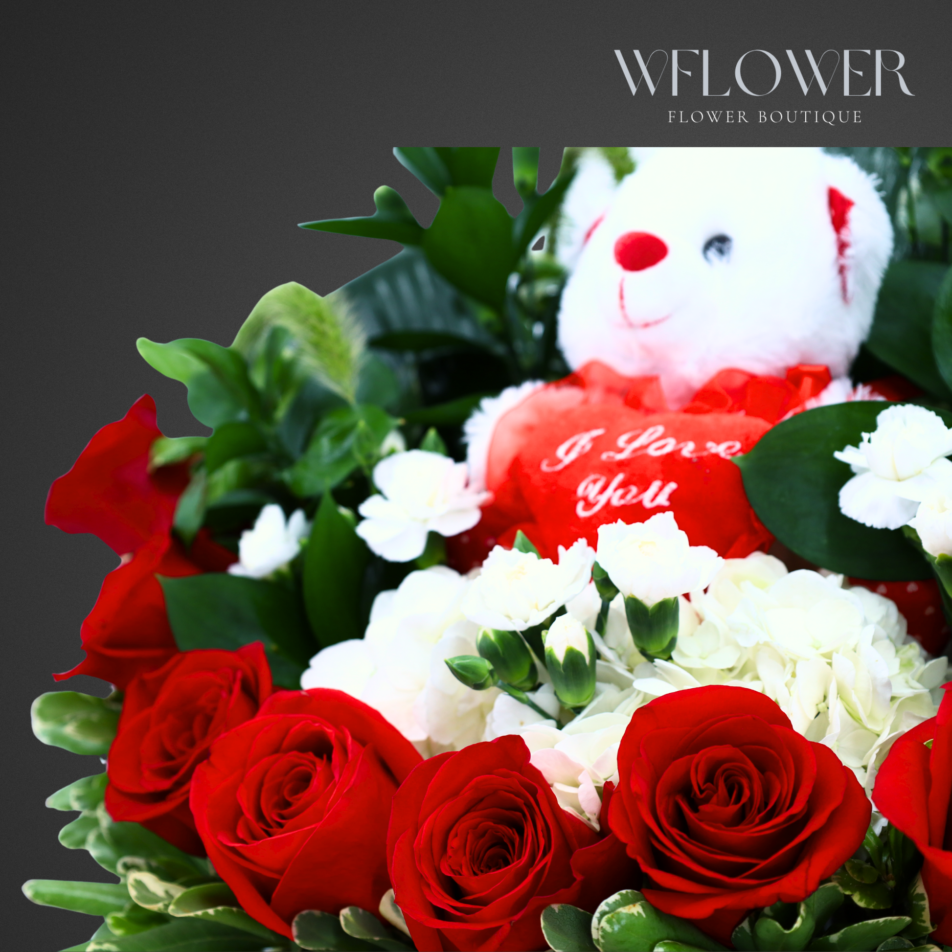 Celebrate love in its sweetest form with Eternal Embrace, a romantic arrangement that pairs the timeless beauty of red roses with a tender keepsake plush bear. A ring of velvety scarlet blooms embraces a bed of snowy hydrangeas and white carnations, framed by lush tropical greenery for depth and elegance. At its heart rests a charming teddy holding a red heart that reads “I Love You,” making this design as meaningful as it is beautiful. Ideal for anniversaries, Valentine’s Day, or simply to surprise someone special, Eternal Embrace is a modern love story expressed through flowers and sentiment.