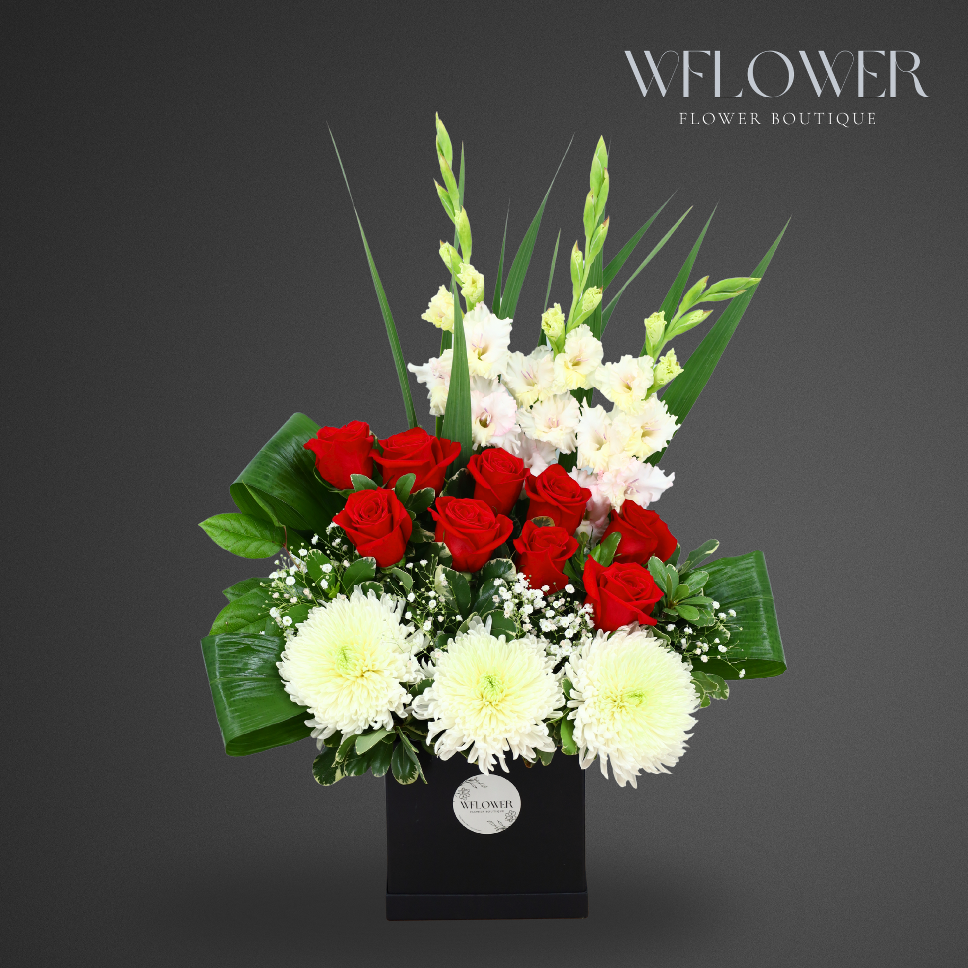 Bold yet refined, Imperial Romance is a striking composition that celebrates the grandeur of love. Deep red roses stand as symbols of passion, while ivory gladiolus and lush chrysanthemums bring balance and grace. Framed with sculpted greenery and delicate accents of baby’s breath, this arrangement is presented in a sleek black box for a truly regal effect. Perfect for anniversaries, grand gestures, or distinguished occasions, it is a statement of sophistication and devotion in every detail.