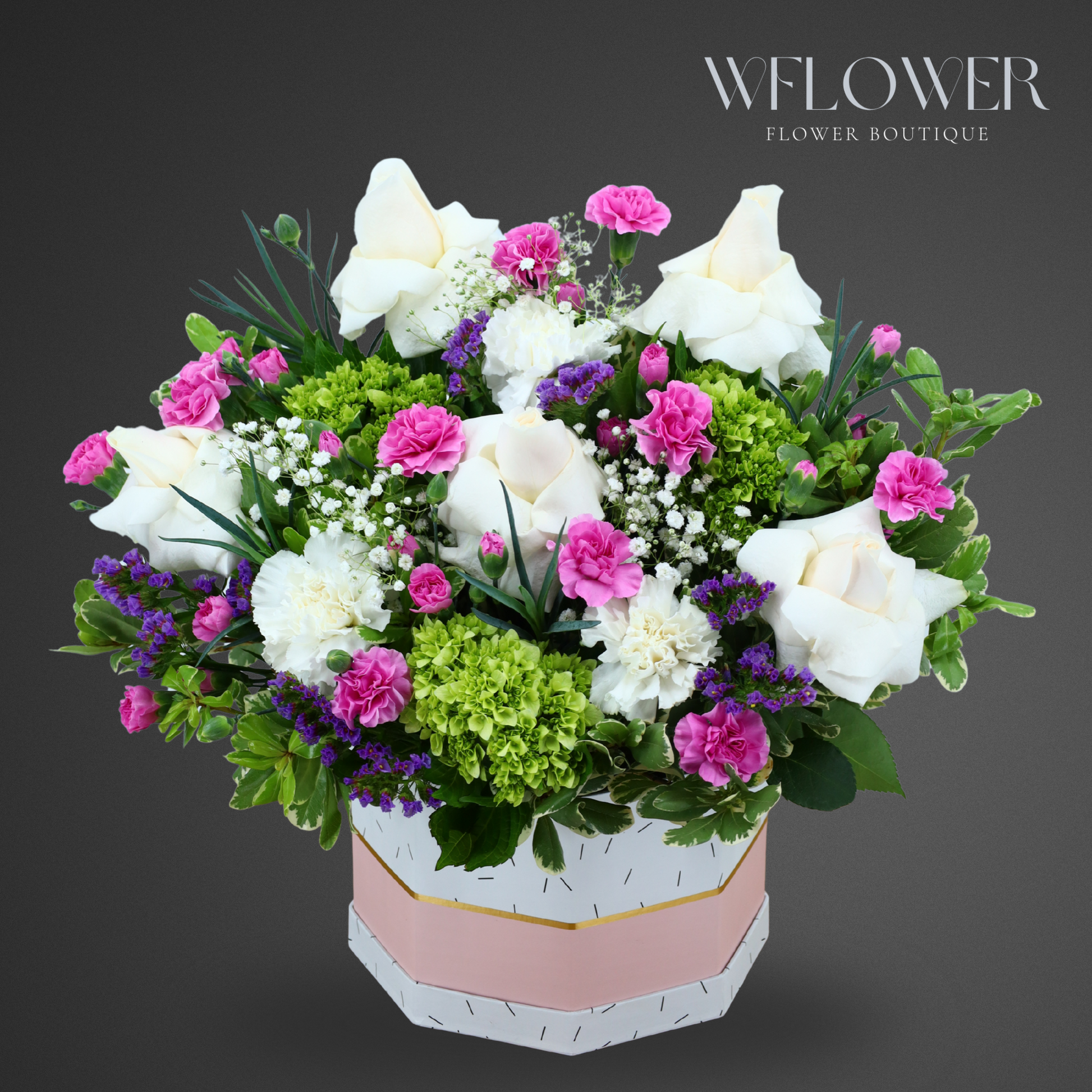 "Ivory Symphony" is a refined arrangement designed to charm with effortless elegance. Creamy white roses set the tone of purity and grace, while vivid fuchsia carnations and delicate gypsophila bring playful romance. Accents of green hydrangea and sprigs of violet statice add a refreshing contrast, creating a balanced palette that feels both lively and sophisticated. Nestled in a chic hatbox, this bouquet makes a timeless statement—perfect for birthdays, anniversaries, or as a gesture of admiration. With its blend of softness and vibrancy, "Ivory Symphony" embodies the beauty of European floral artistry and brings a touch of enchantment to any occasion.