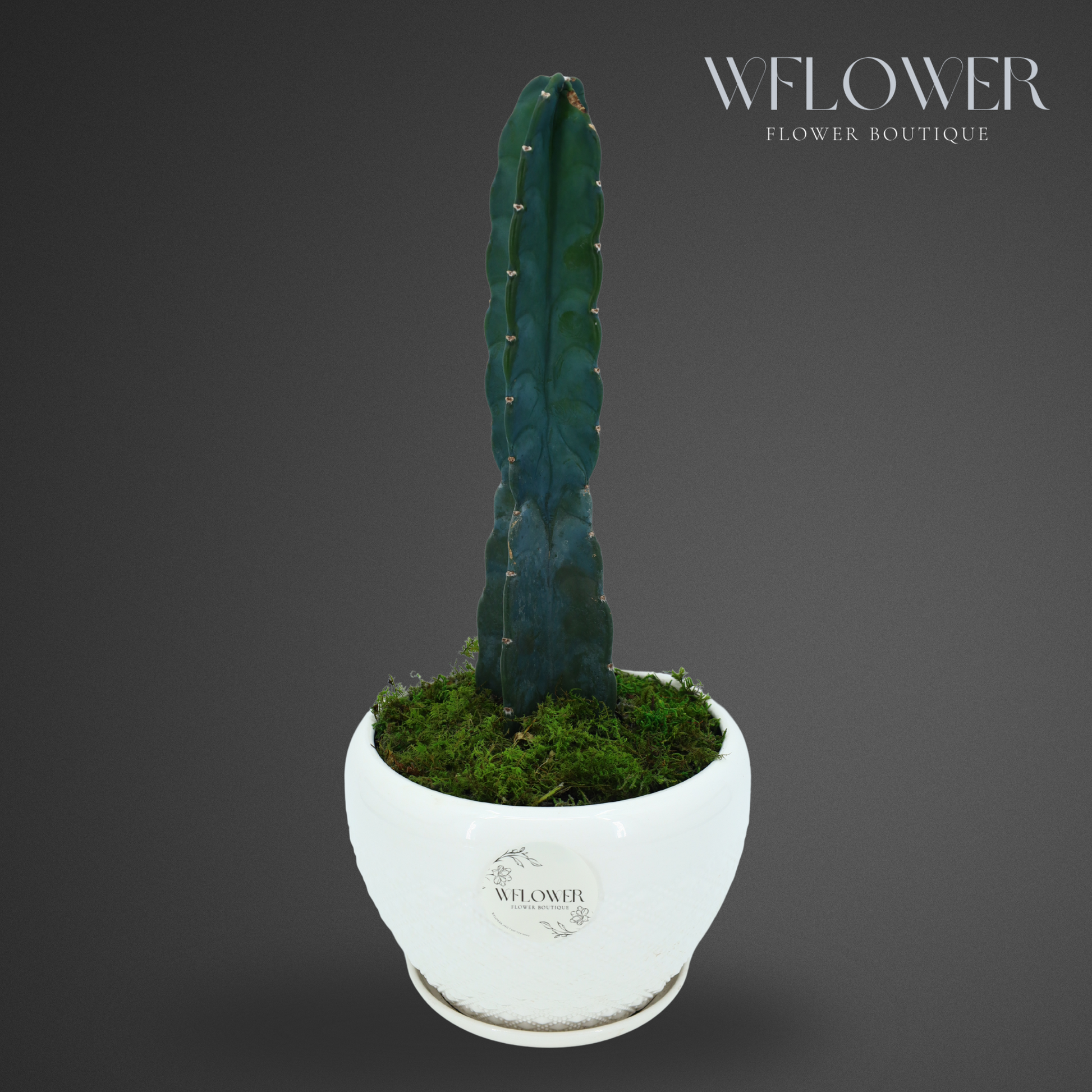 Bold yet elegant, this large cactus captivates with its tall, sculptural presence, enhanced by a base of rich green moss. Housed in a finely textured white ceramic planter, it embodies both modern minimalism and timeless luxury. Its clean lines and striking form make it a sophisticated statement piece, perfect for elevating living rooms, entryways, or office spaces with refined greenery. Low-maintenance yet visually commanding, this cactus is an ideal choice for those who value enduring beauty with effortless care. A distinguished gift or a centerpiece for any interior, it reflects strength, resilience, and quiet sophistication.