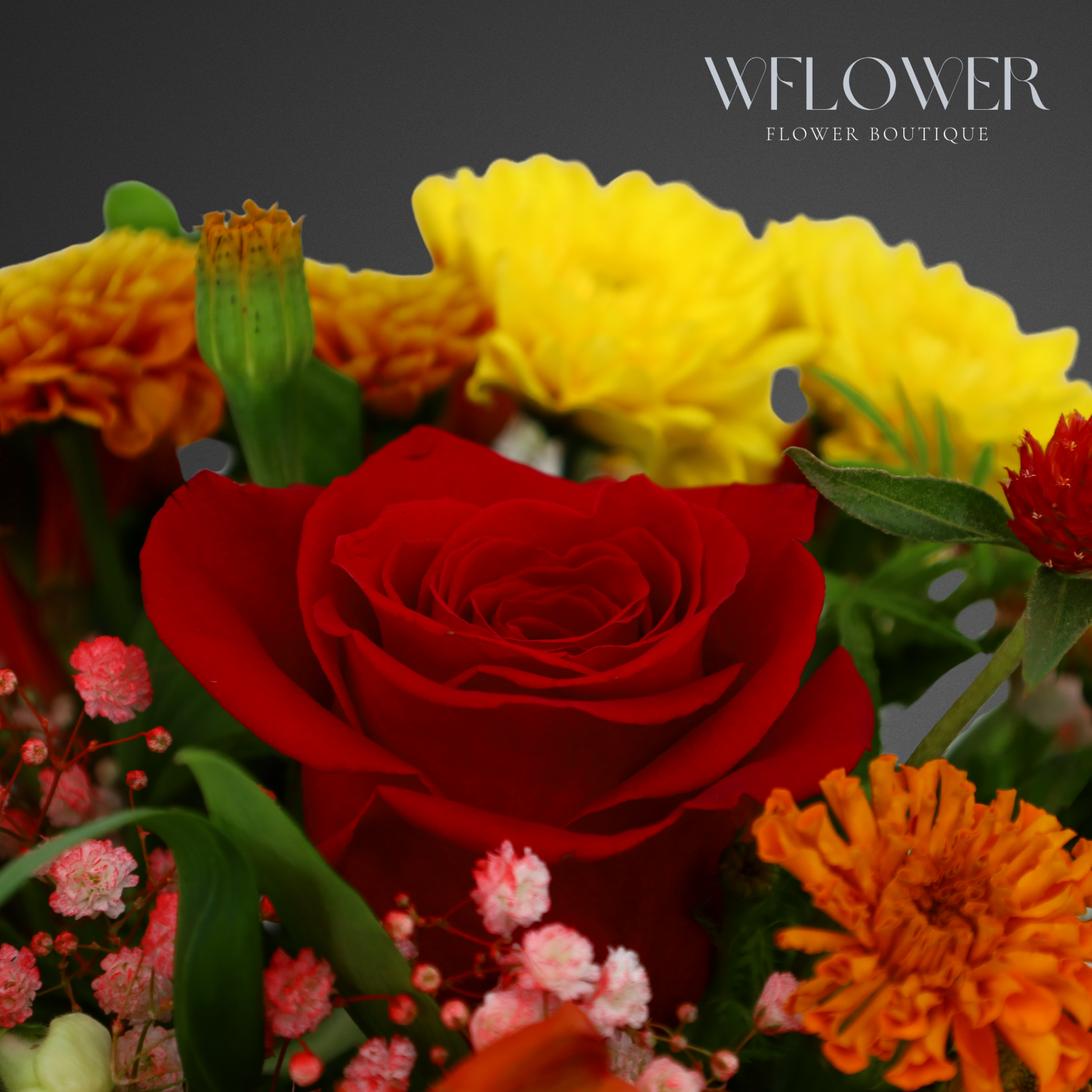 Bursting with color and festive cheer, Harvest Smile brings the playful essence of fall into elegant bloom. A radiant mix of marigolds, orange chrysanthemums, yellow alstroemeria, red carnations, and green carnations creates a lively dance of autumn hues, perfectly arranged in a yellow Jack-o’-lantern vase. This design bridges fun and sophistication—the warmth of fall gatherings with the artistry of WFLOWER’s luxury aesthetic. Ideal for gifting, decorating, or brightening a seasonal celebration, Harvest Smile embodies the happiness of autumn in full bloom.
