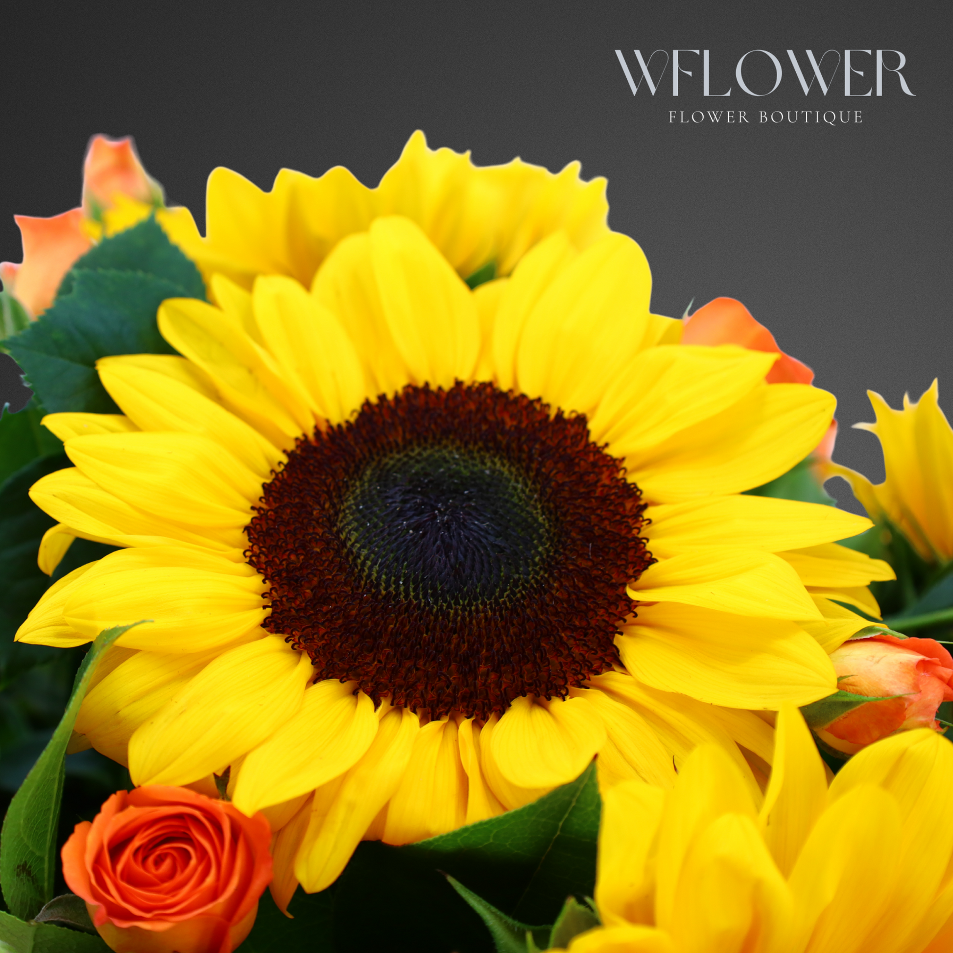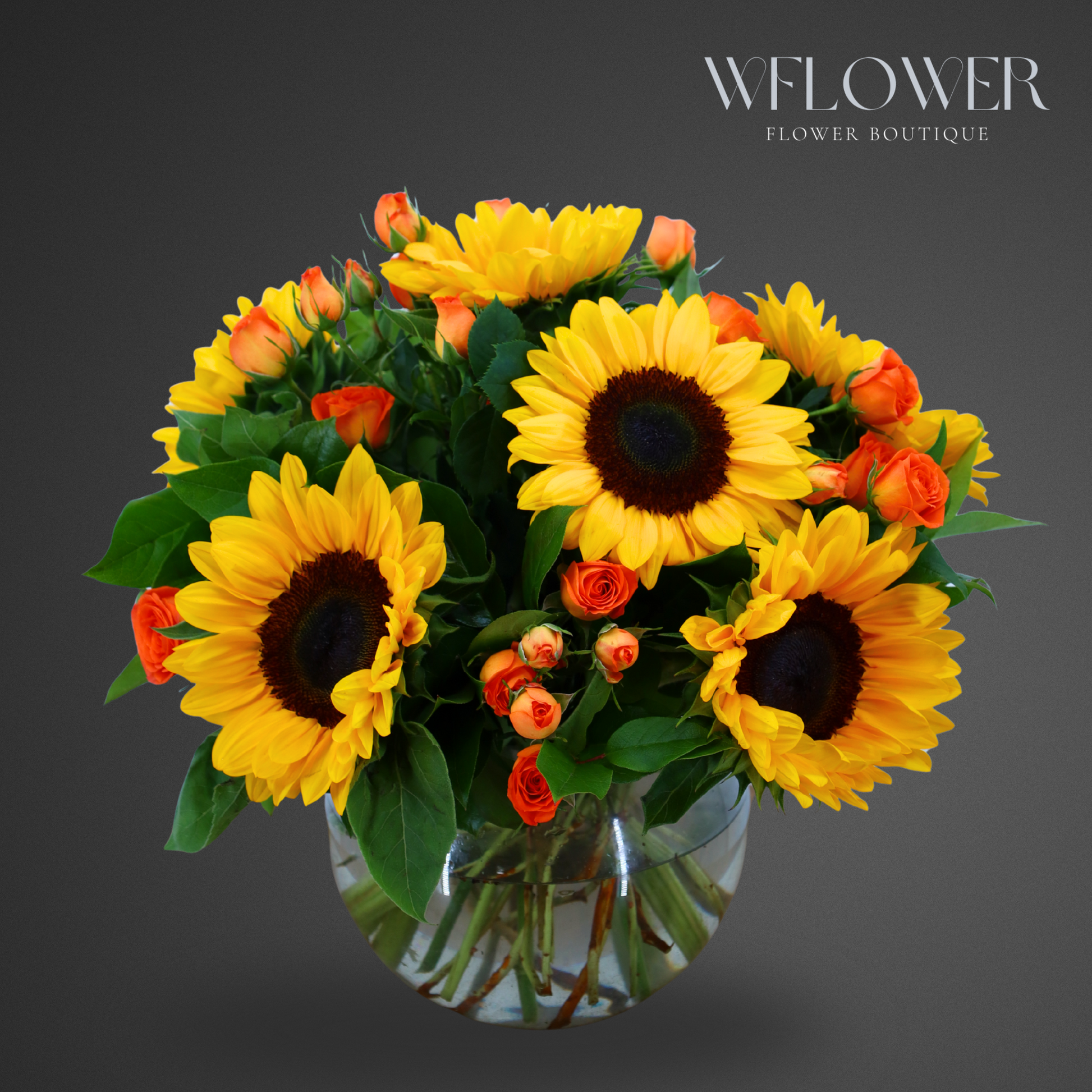 Sunshine Elegance is a radiant expression of joy and refinement. Bright golden sunflowers beam with warmth, complemented by vibrant orange spray roses that add a touch of cheerful sophistication. Designed in a clear glass vase, the arrangement showcases the natural beauty of each stem, creating a fresh, modern, and uplifting design. Perfect for birthdays, congratulations, or simply to bring light and happiness into any setting, Sunshine Elegance is a gift that captures the brilliance of sunshine with timeless grace.