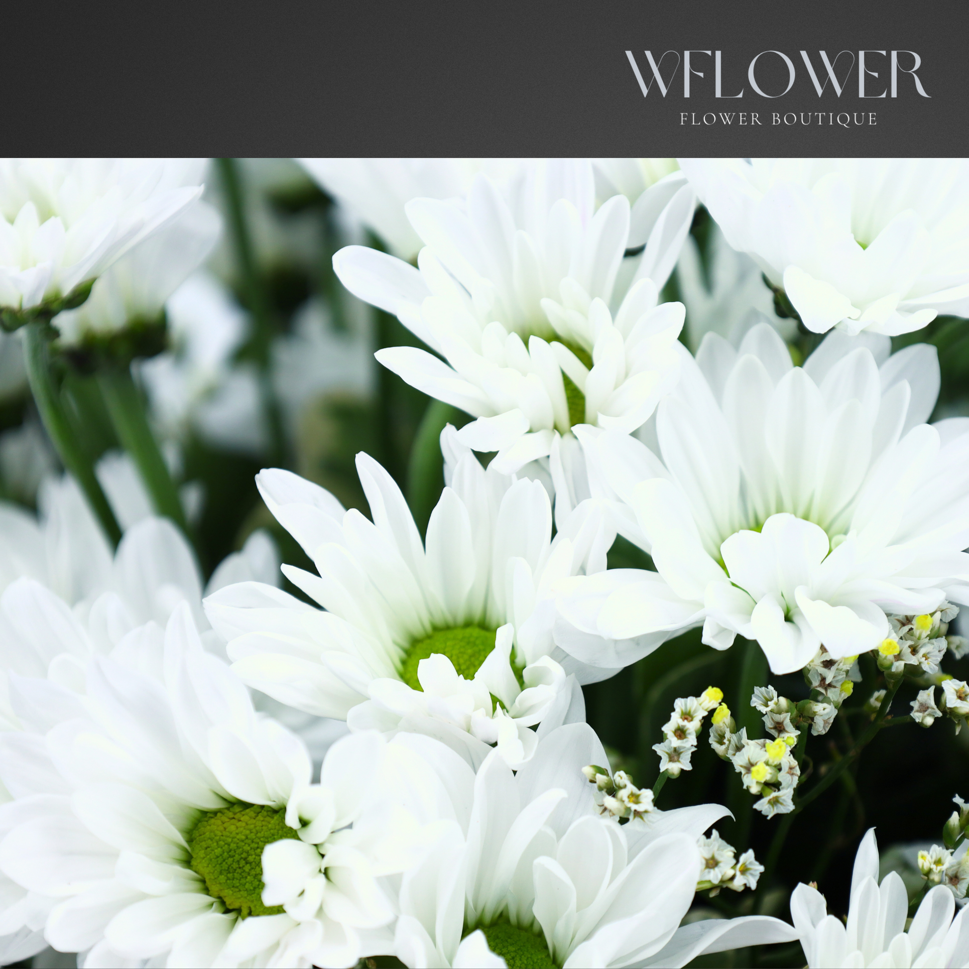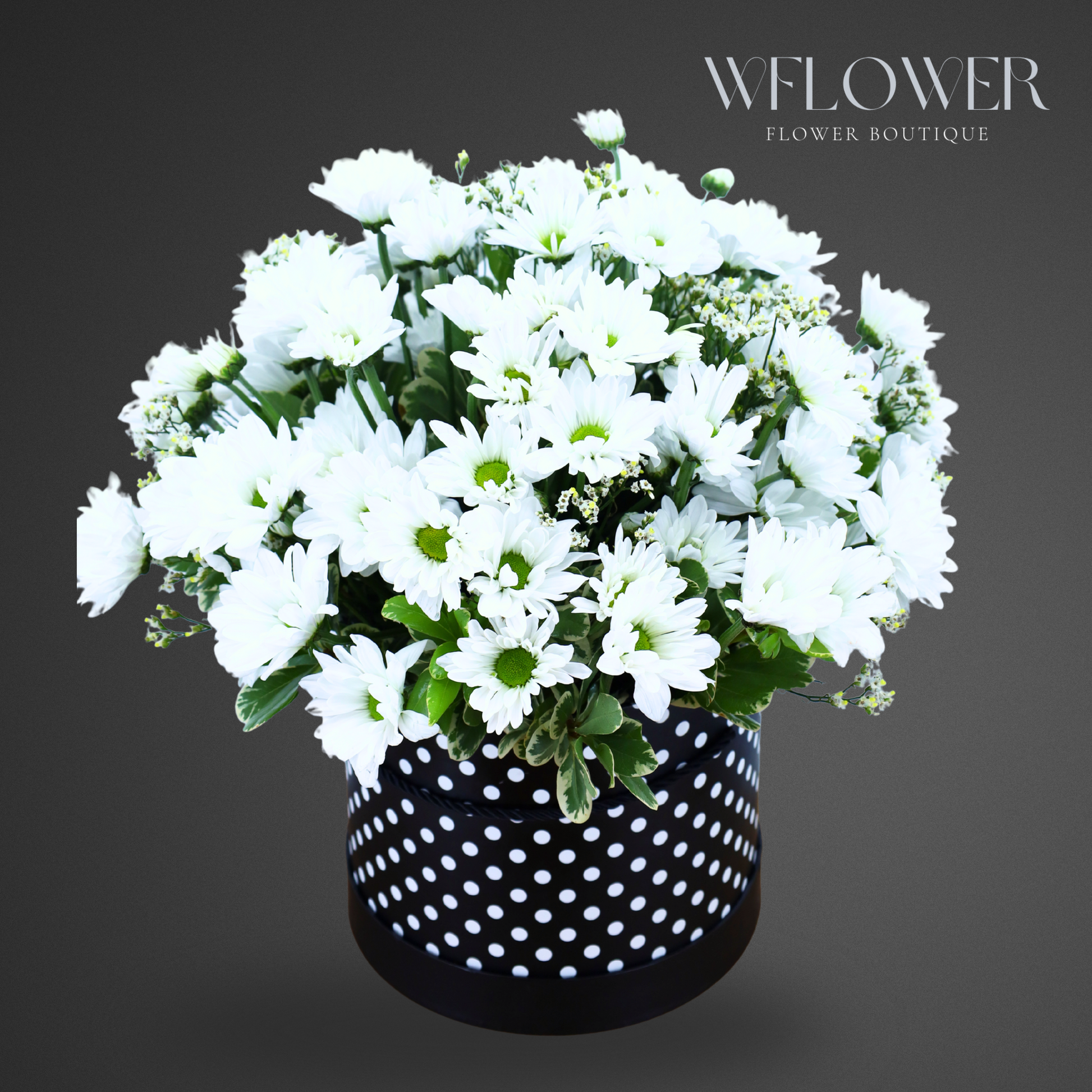 White Whisper is a graceful arrangement that speaks in the language of simplicity and purity. A lush cloud of fresh white daisies, softened with touches of delicate filler blooms and greenery, creates a refreshing, airy elegance. The clean beauty of this design radiates peace and sophistication, making it a versatile gift for life’s most meaningful occasions — from celebrations of love to thoughtful gestures of comfort. Presented in a chic polka-dot designer box, this arrangement carries both modern charm and timeless grace.